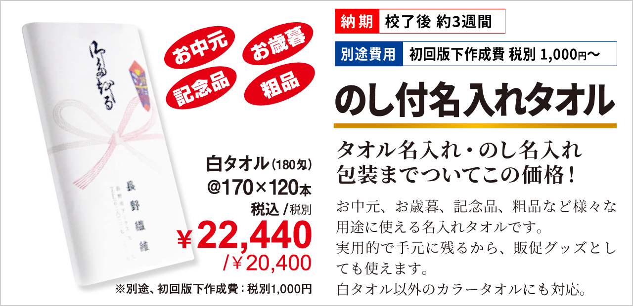 ・上記価格は1色刷り(片面平地部分)の価格です(ベタ刷り不可)・ロゴマークの取り込み等は別途 税別2,000円~・名入れ印刷1色増しは別途1本あたり税別30円プラス・タオル本体名入無し1本あたり税別10円引き