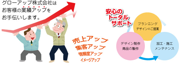 | 2004年4月 ハンコ卸売センター 開業 2007年4月 印刷館 OPEN 2010年4月 かんばん屋 OPEN 2011年9月 グローアップ株式会社 設立 2013年4月 製作工場移転【150坪】 |